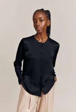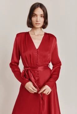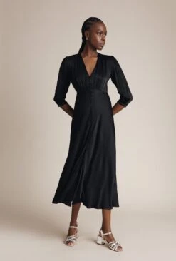 Designed in stunning satin, our knee-length Meryl dress in black is a pretty button-through style that features pleats at the padded shoulders, seaming at the waist for a glamorous silhouette and a wrap tie to complete the elegant look. The bias-cut skirt makes for a flattering fit, while the front split adds a touch of femininity showcasing just the right amount of leg. Wear yours with stylish heels for a cocktail party or dinner date – plus it would also make the perfect bridesmaid’s dress.